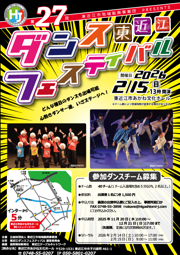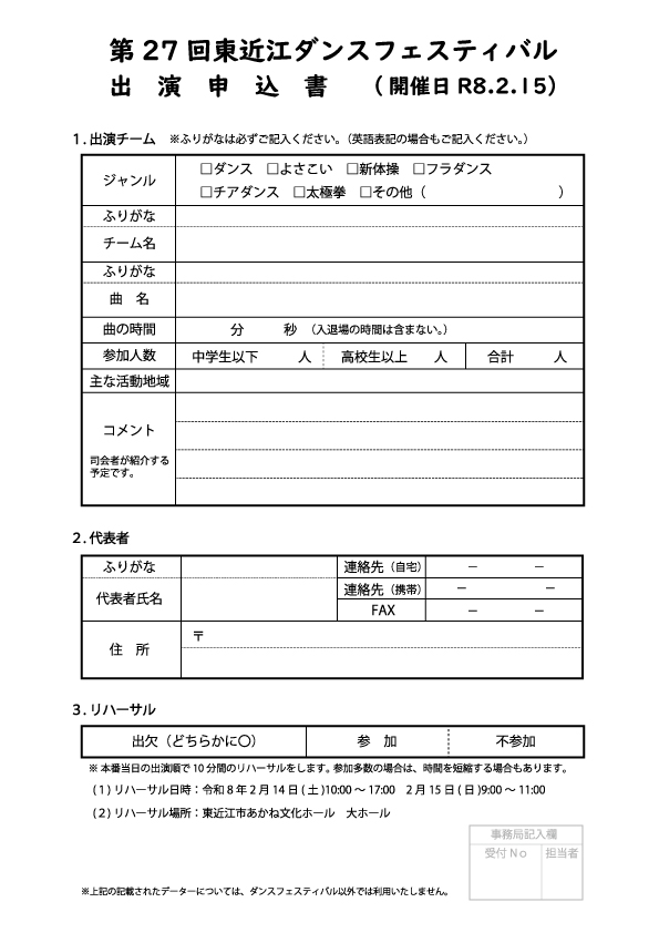 下記の東近江ダンスフェスティバル出演申込書に記入の上、ファックス(0748-55-3898)かあかね文化ホール事務所にてお申込みください。