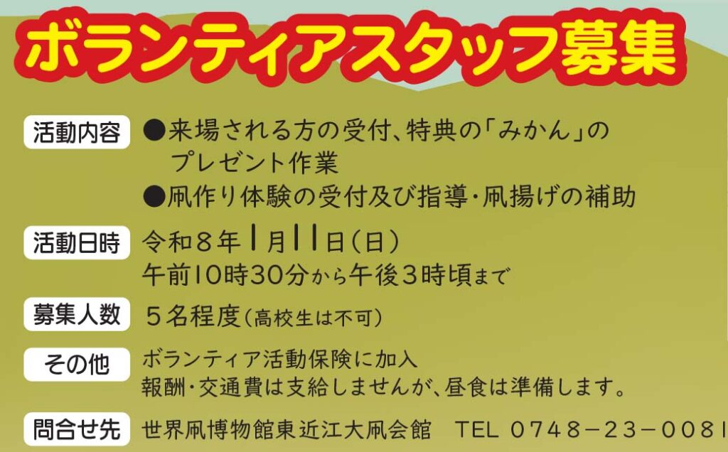 令和8年1月11日(日)に開催する「新春凧揚げ大会」(主催:東近江大凧保存会、公益財団法人東近江市地域振興事業団、会場:聖徳中学校)のボランティアスタッフを募集します。