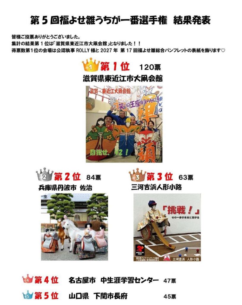 東近江大凧会館は、全国32会場で開催された「第16回福よせ雛」の人気投票イベント「第5回 福よせ雛 うちが一番選手権」(20か所の会場が参加)において、昨年に引き続き全国第1位を獲得したことをお知らせいたします。