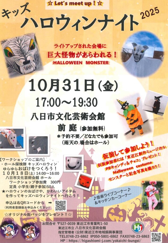 ライトアップされた会場に巨大怪物が出現!八日市文化芸術会館の前庭でハロウィンナイトを楽しもう!仮装参加で一緒に写真を撮ろう!音楽ライブやパーカッション体験コーナー、FOODコーナーなどもあります。仮装参加者者にはキャンディプレゼント!